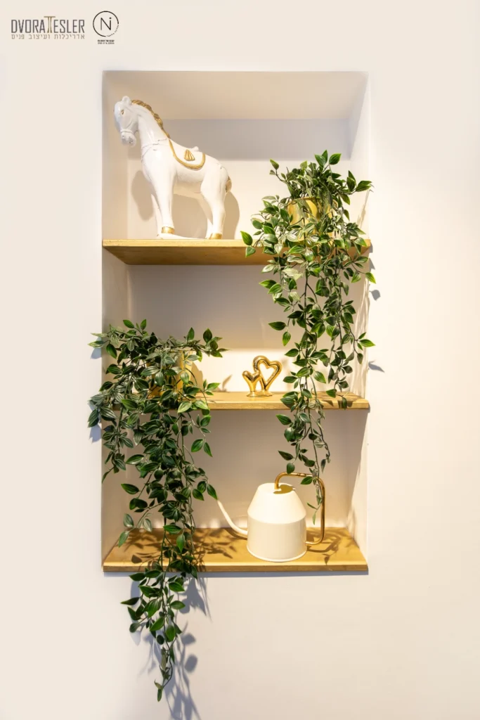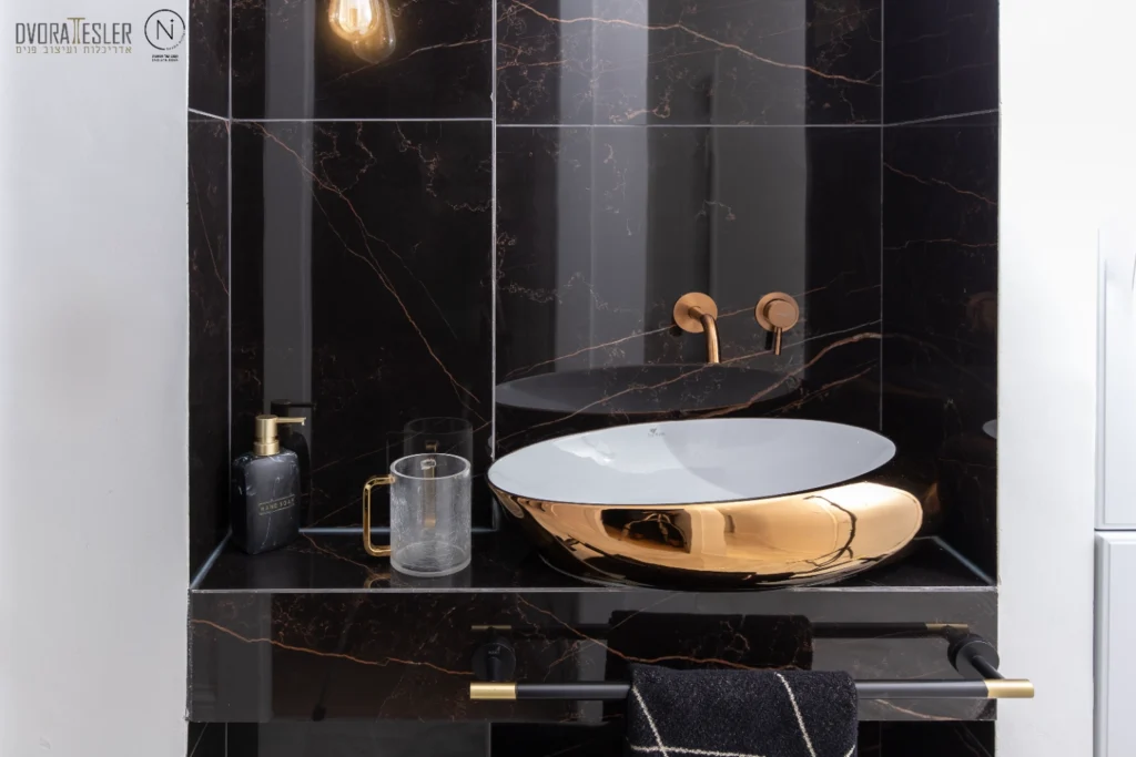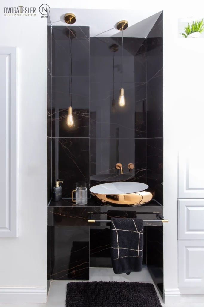 שימו לב לכיור שחור ודרמטי ונישה שלצידו שהייתה מיועדת לארון חשמל ונוצלה לטובת פינת צמחייה דקורטיבית.