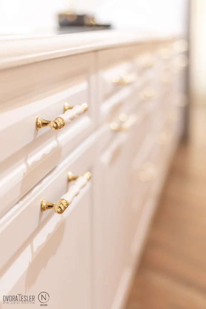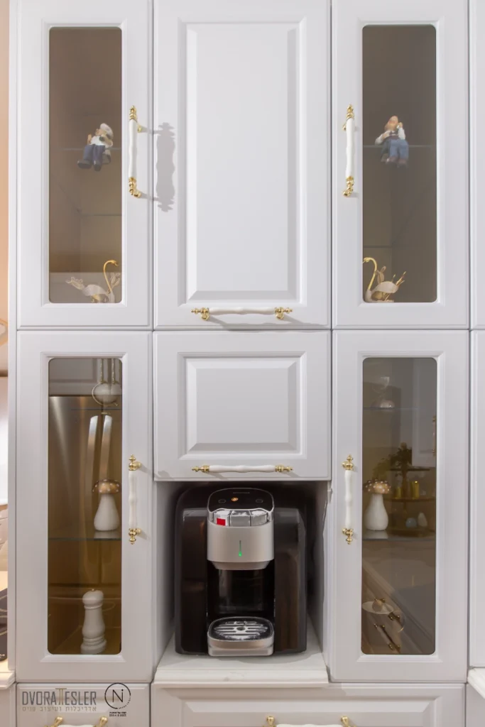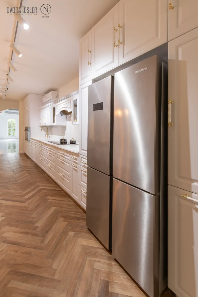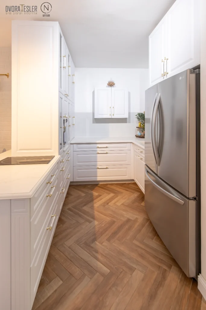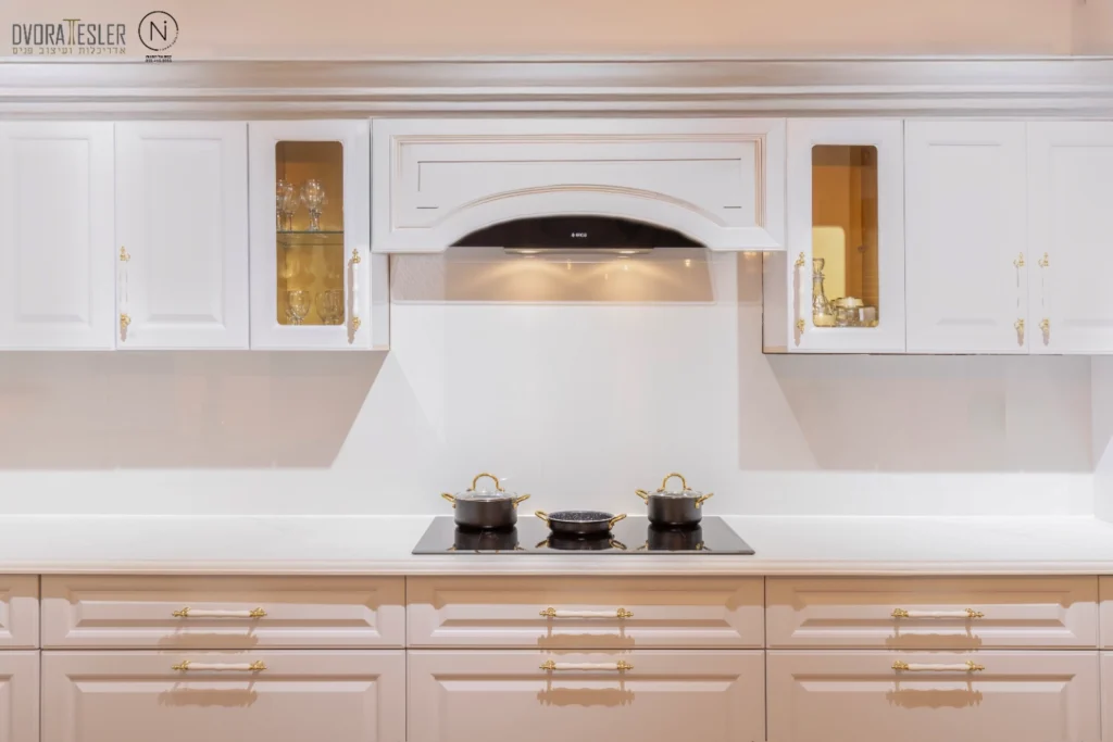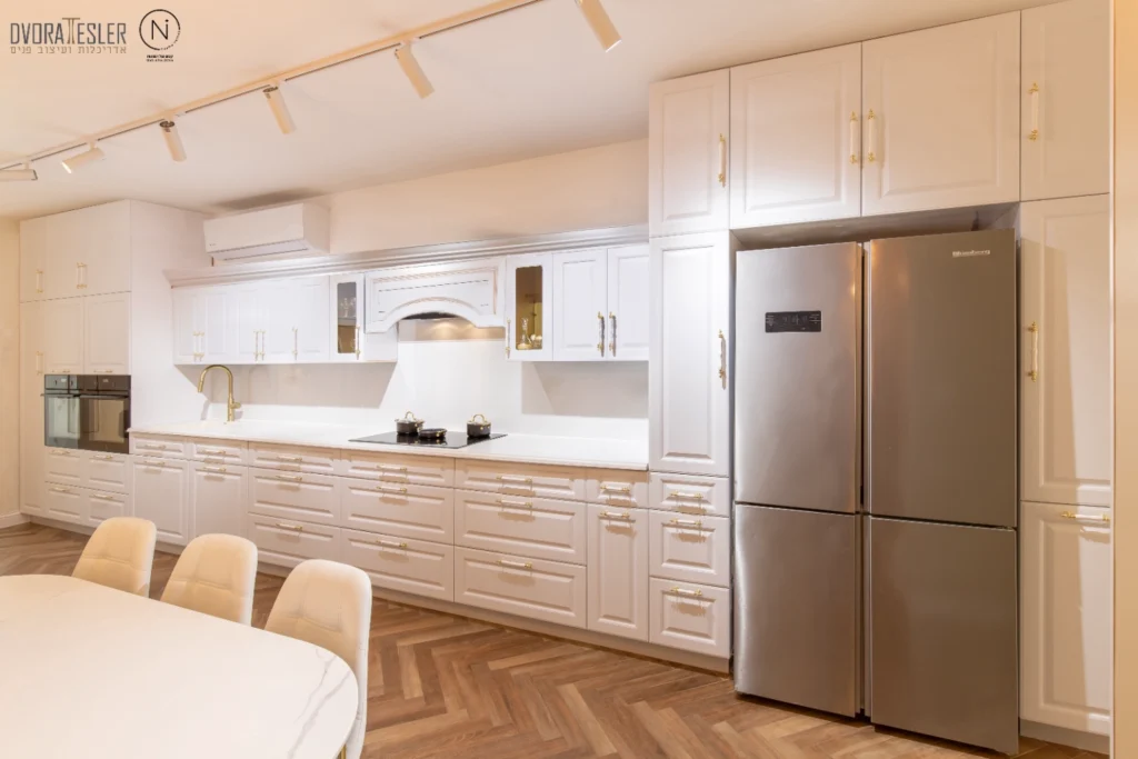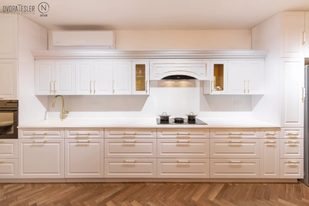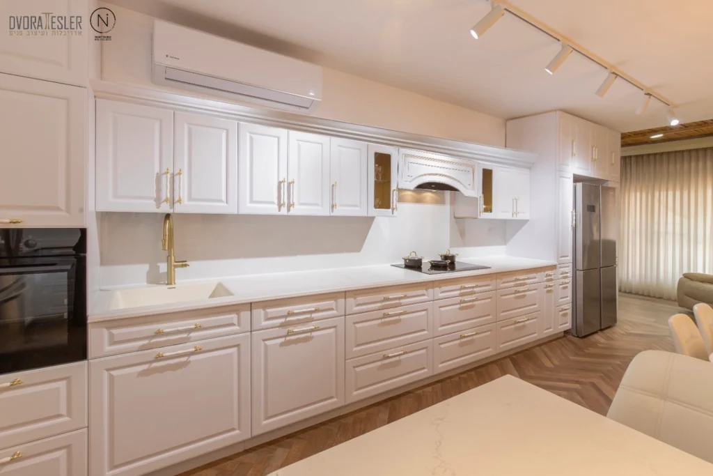 הקו העיצובי שנבחר הוא לבן, מפואר ומסוגנן אירופאי, בשילוב עם רצפת פרקט חמימה יחד המטבח נותן אפקט יוקרתי אך שומר על אווירה חמה ומשפחתית. שימו לב לתאורה חזקה ממש, ובשפע, כדי שחווית הבישול תהיה קלה ובהירה. תאורת אווירה נמצאת גם היא- בתוך הויטרינות.