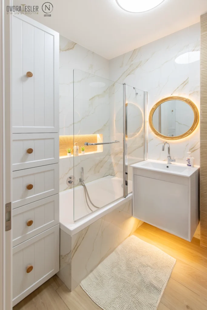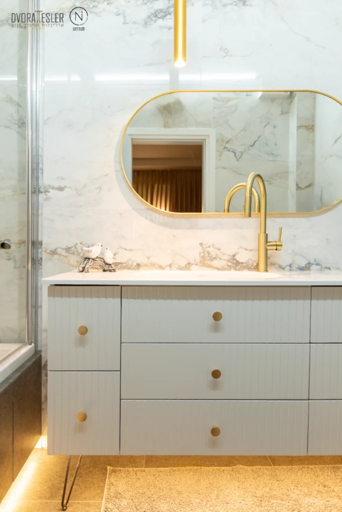 שטחי האחסון מתוכננים בקפידה: ארון גדול המציע המון מקום אחסון, ומגירות רחבות ונוחות. והכיור מעוצב כך שיהיה מותאם לרחיצת הבייבי התורן .