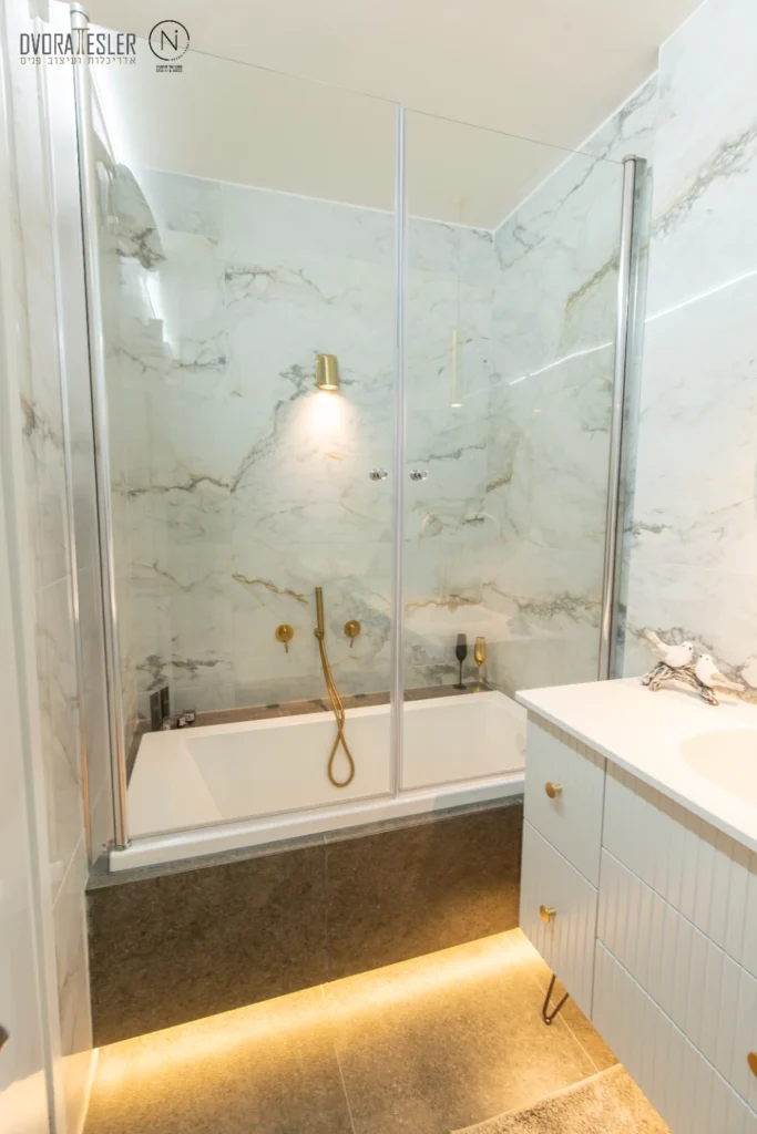 חדר הרחצה מעוצב כסוויטת ספא יוקרתית ומשלב יוקרה עם חמימותשמתבטאת בירידה עד לפרטים הקטנים. הותקנה אמבטיה בעלת שוליים רחבים במיוחד המיועדים להנחת סבונים, ואבזורים שונים. תאורה נפרדת שולבה בתוך האמבטיה ליצירת אווירה ייחודית.