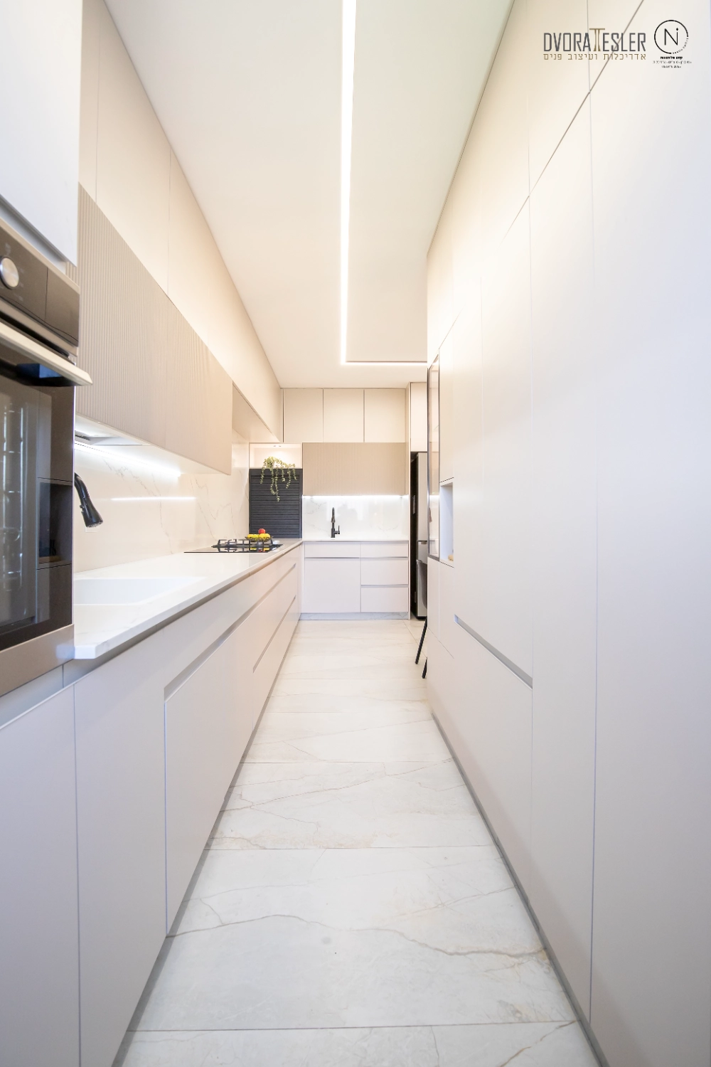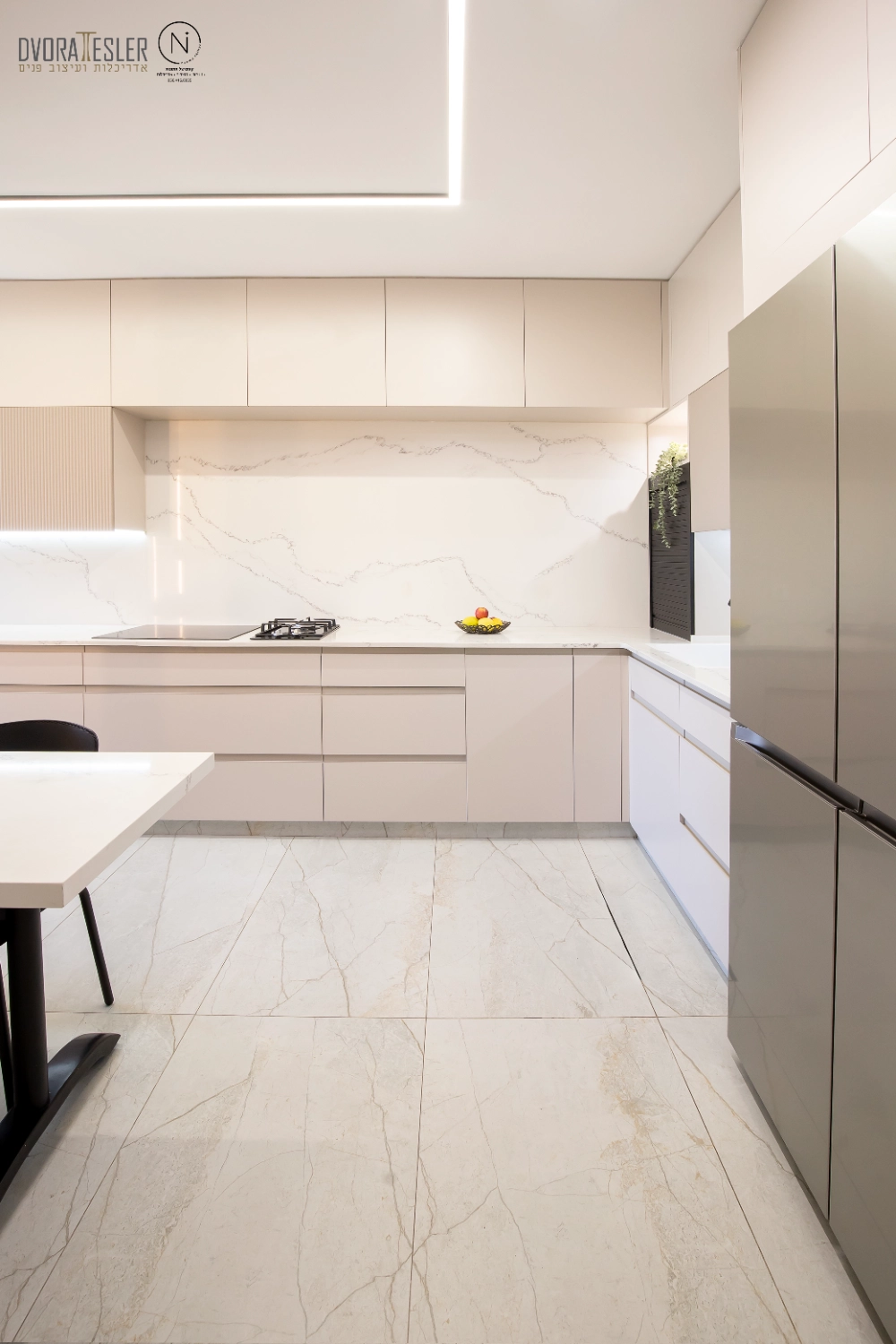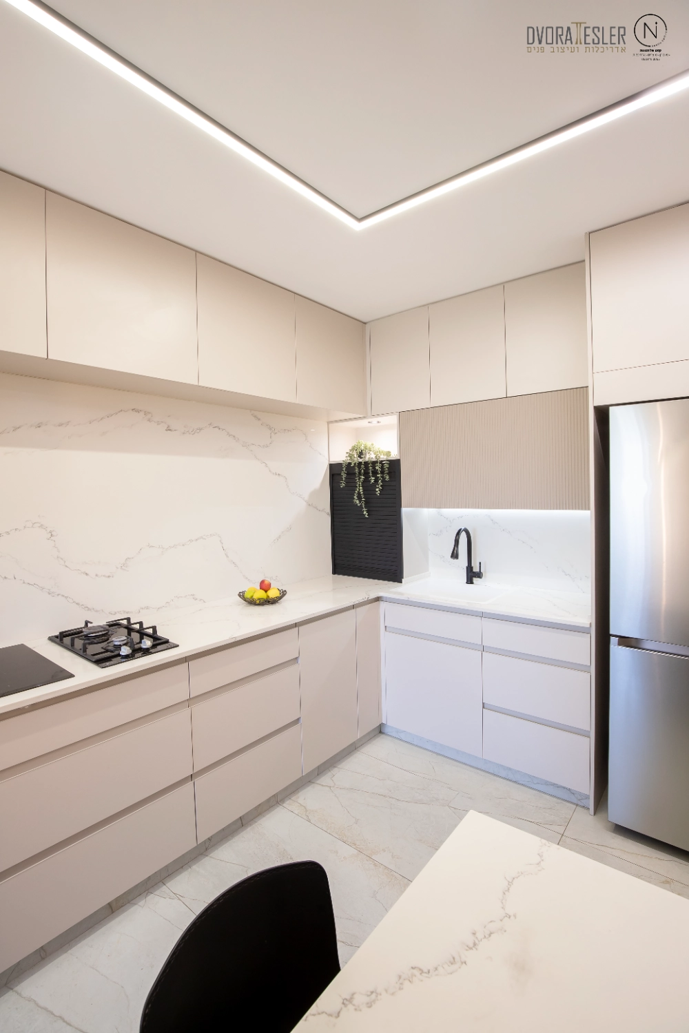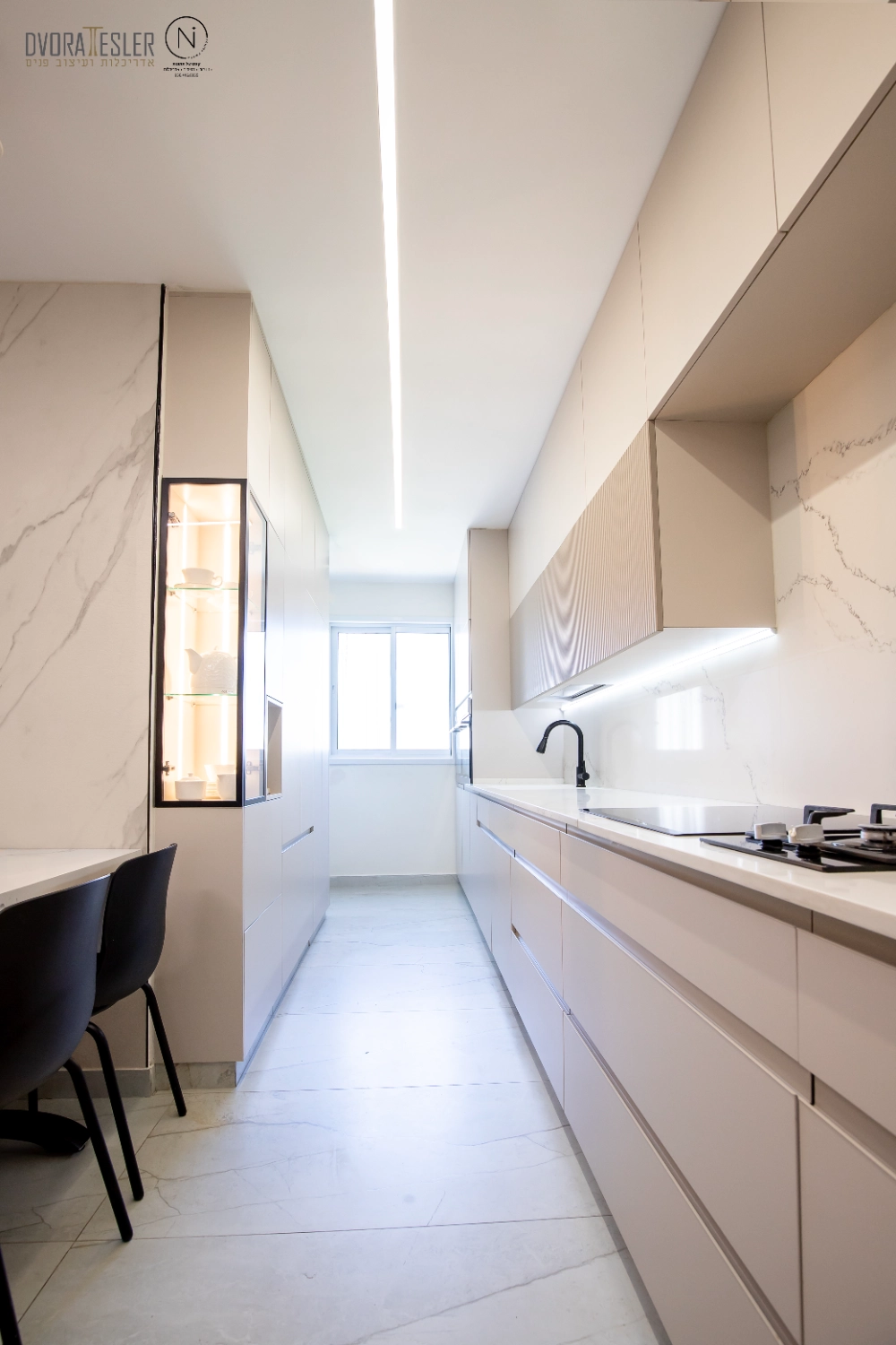 התחלתי בשינוי מיקום דלת הכניסה, מה שאפשר לי קיר שלם נוסף ומקומות אחסון. בנוסף, תוכננה חזית אחידה לארונות שטומנת בחובה הפתעות: הטמעתי את המכונה והמייבש בתוך ארון בעומק 70 ס"מ, ולצידו טמון מזווה פסח רחב בעומק 40 ס"מ, שהותאם בדיוק לקו העמודים כדי "ליישר קו" וישנה גם ויטרינה ייחודית בעומק 20 ס"מ שמשלימה את החזית ומותירה מראה הומוגני, אחיד ונקי. משטחי השיש הורחבו לאזורים ענקיים, וניתנה האפשרות להתקין מוקדי בישול כפולים גז ואינדוקציה, (כי הלקוחה הבשלנית טוענת שחציל על האש לא דומה לחציל על אינדוקציה:) אפילו המקרר הענק השתלב נפלא, כשמאחוריו קיר דקיק.