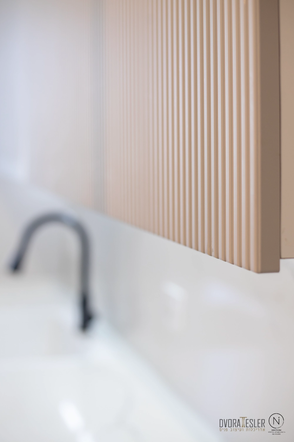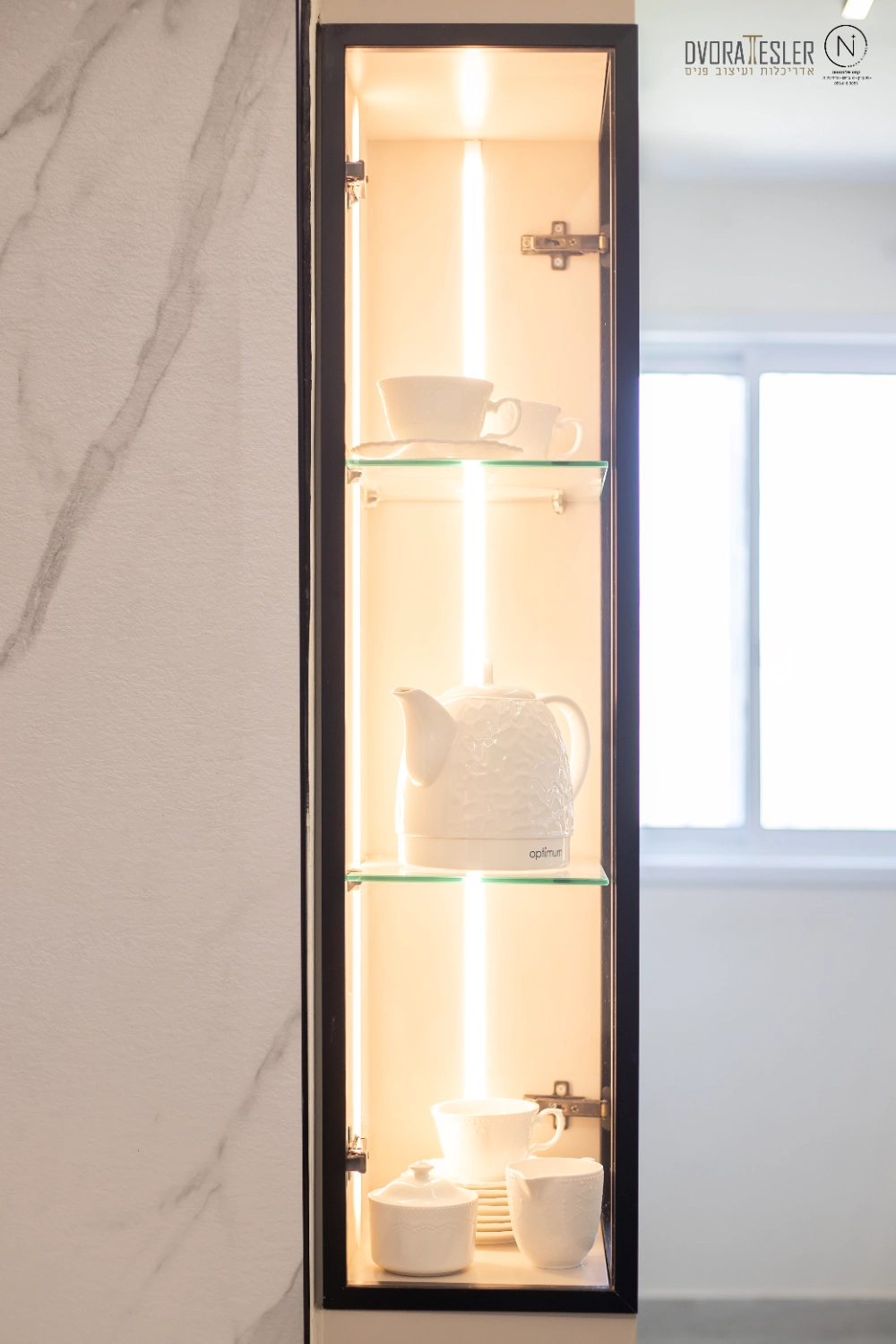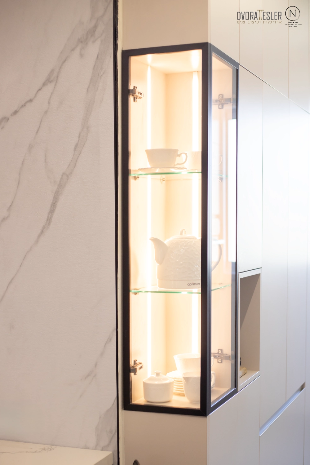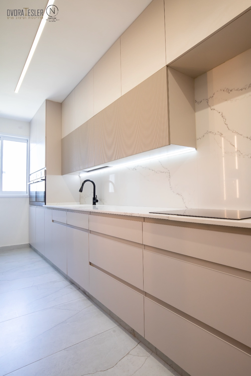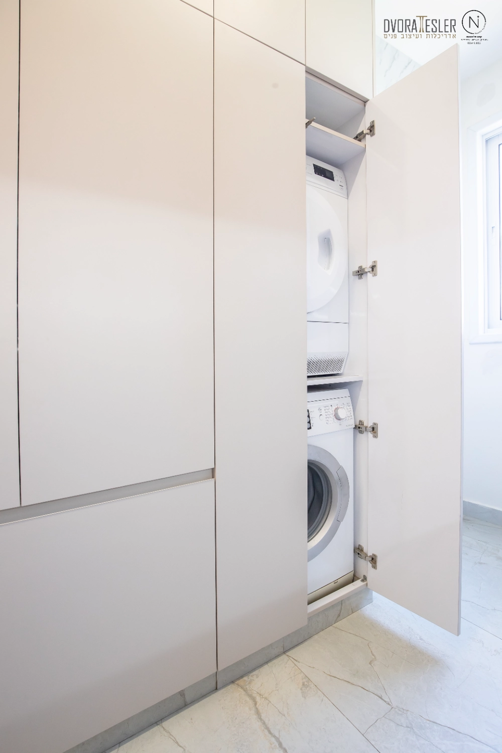 התחלתי בשינוי מיקום דלת הכניסה, מה שאפשר לי קיר שלם נוסף ומקומות אחסון. בנוסף, תוכננה חזית אחידה לארונות שטומנת בחובה הפתעות: הטמעתי את המכונה והמייבש בתוך ארון בעומק 70 ס"מ, ולצידו טמון מזווה פסח רחב בעומק 40 ס"מ, שהותאם בדיוק לקו העמודים כדי "ליישר קו" וישנה גם ויטרינה ייחודית בעומק 20 ס"מ שמשלימה את החזית ומותירה מראה הומוגני, אחיד ונקי. משטחי השיש הורחבו לאזורים ענקיים, וניתנה האפשרות להתקין מוקדי בישול כפולים גז ואינדוקציה, (כי הלקוחה הבשלנית טוענת שחציל על האש לא דומה לחציל על אינדוקציה:) אפילו המקרר הענק השתלב נפלא, כשמאחוריו קיר דקיק.